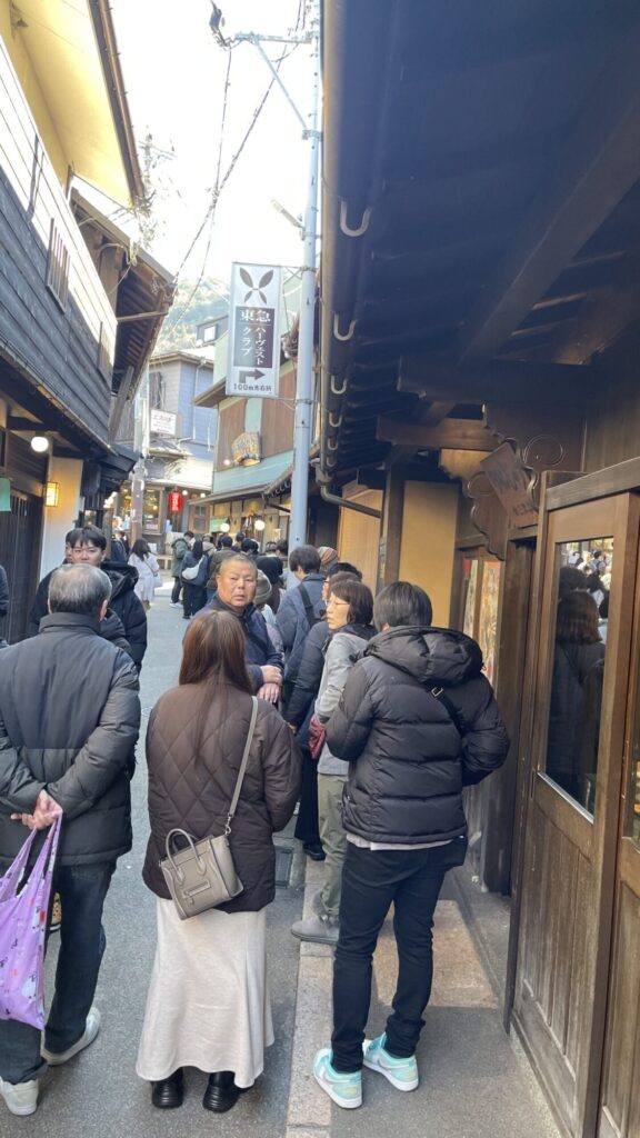 有馬虫地獄を経て13時に有馬温泉街へ到着すると、そこはお正月休みに入ったためか、人でごった返していました。どのお店も大混雑で、いつもの雰囲気とは一変。観光地ならではの年末の賑わいを目の当たりにしました。