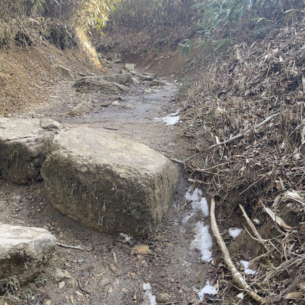 標高を上げるにつれ、空気の肌触りが変わる。日向のぬくもりとは裏腹に、岩陰には氷の刃が鋭く潜み、僅かな雪が去りゆく冬の執念のようにへばりついていた。アイゼンを穿つほどではない。そして、山道の両脇には、猪が餌を求めて掘り返した後が露わでした。