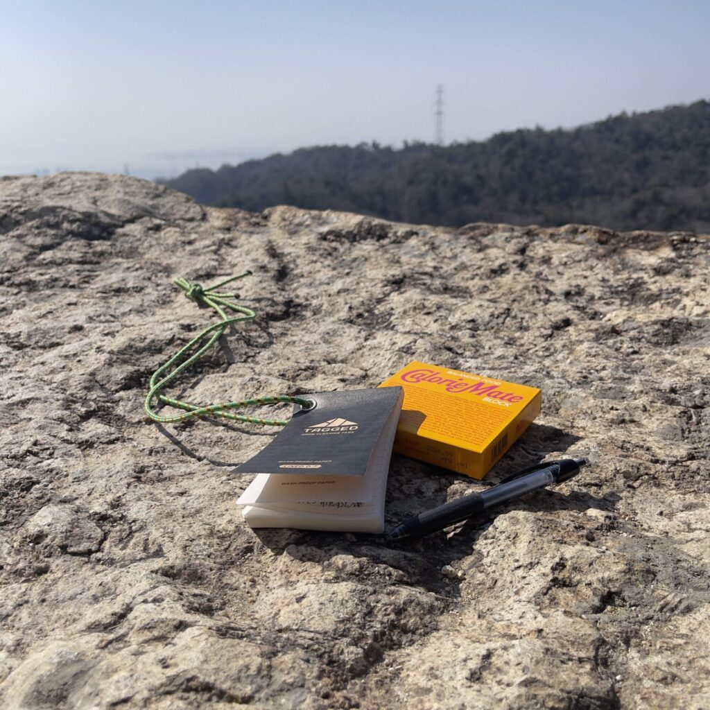 いつもは足早に通り過ぎる山頂の休憩所ですが、今日は珍しく足をとめて補給タイム。