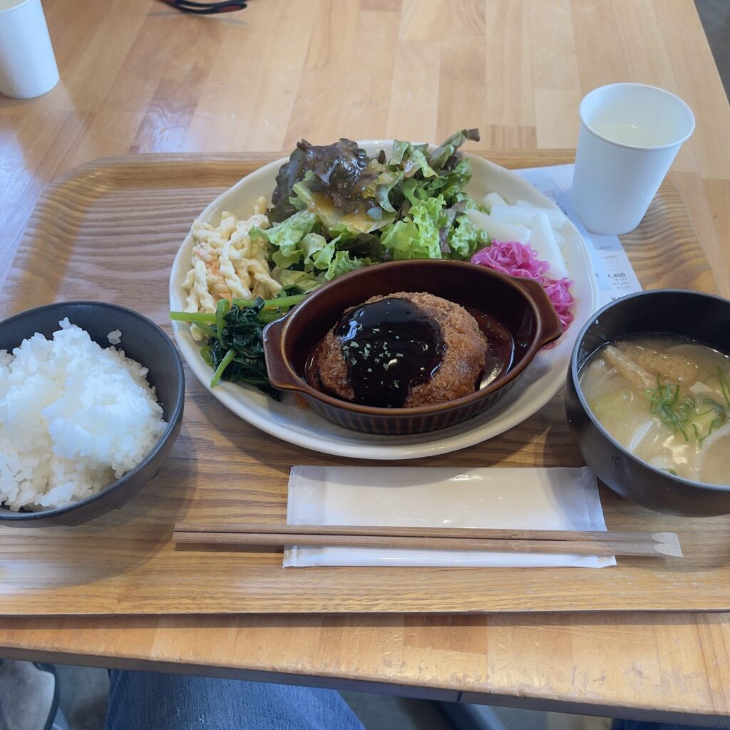 打ち合わせを終えると、三田に住む友人に連絡をしてランチでも、という流れになった。向かったのはフルーツフラワーパーク。土曜日ということもあって、駐車場はすでに家族連れで賑わっていた。子どもたちの声が飛び交う中で食べるミンチカツ定食は、なぜかいつもより旨い気がした。旅の途中の飯は、どこで食べても旨いのだ。
