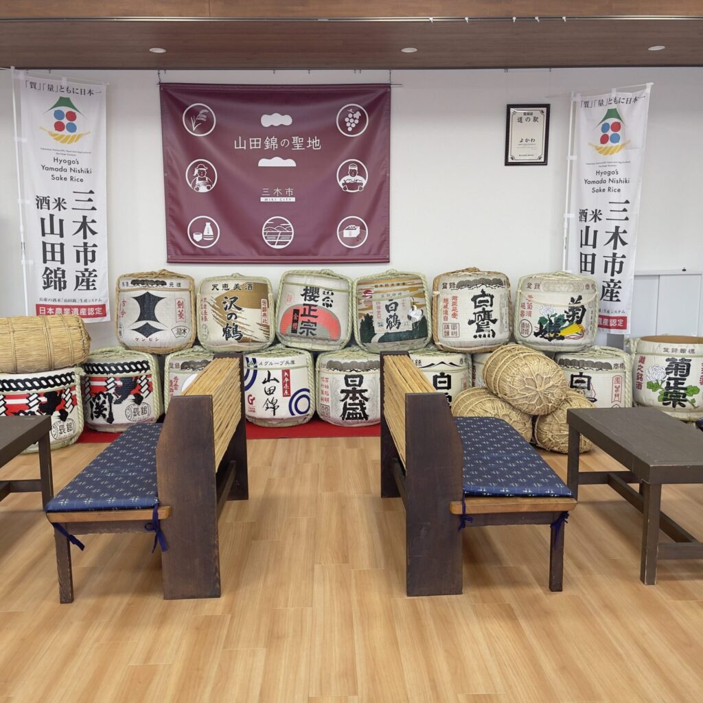 「山田錦の聖地・三木市」と書かれた幕の前に、全国の酒蔵の樽がずらりと並んでいた。白鶴、櫻正宗、菊正宗、白鷹——灘の銘酒を支えてきた米が、この丘陵地で育てられている。バイクで走っていると、沿道の田んぼがいつもとは違って見えた。夕方の光を受けてゆるやかに輝く稲の緑は、ただの風景ではなく、土地そのものの息吹のように感じられた。