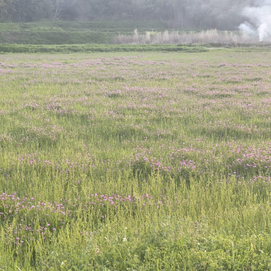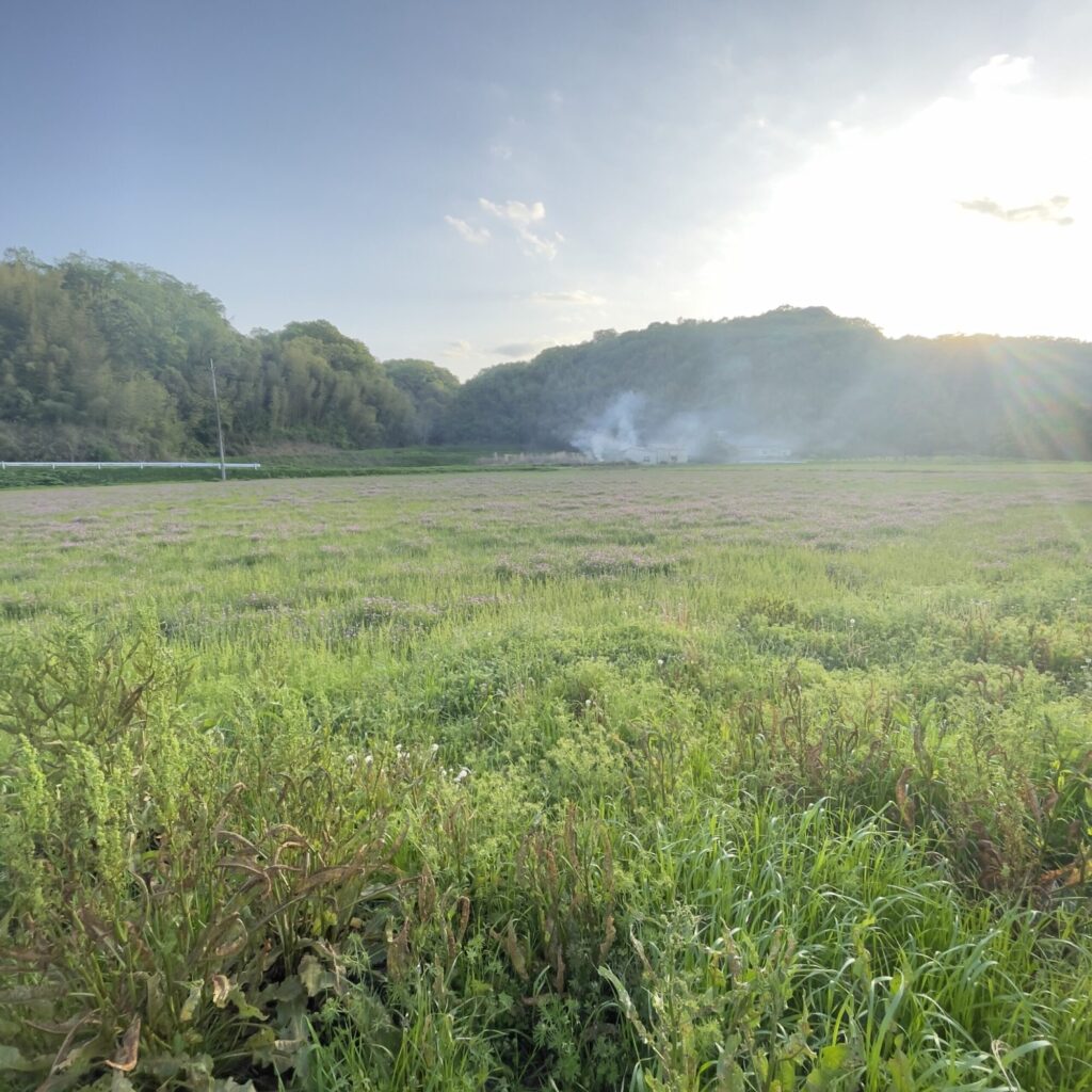 どこかの田んぼの端では、刈った草を燃やす煙がまっすぐ空に昇っていた。ああ、春が本格的に動き出している。しばらく見たことのなかったれんげ畑の光景に気持ちが和む。